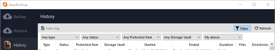 Click the "Filter" icon to toggle displaying the Filter pane. The Filter pane allows you to filter the displayed jobs by status, classification, Protected Item, Storage Vault, and device.