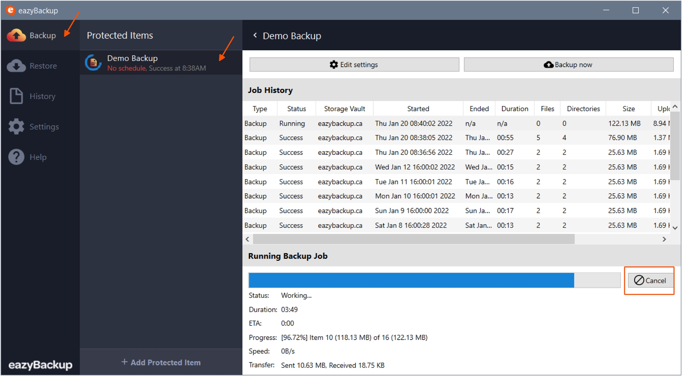 Running backup jobs can be cancelled from within the desktop application or from the Control Panel.