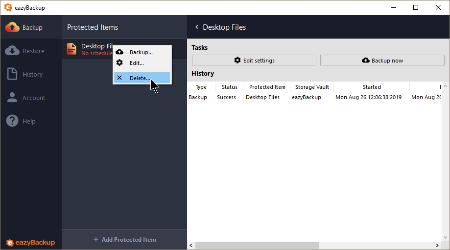 You can delete a Protected Item from the client user interface. Open eazyBackup, select the "Backup" tab, right click on the Protected Item and choose "Delete". Confirm you want to delete the Protected Item.