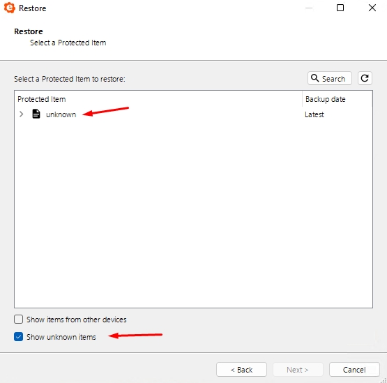 To restore files from a protected item that has been deleted, open the restore menu in the eazyBackup app , select the storage vault, check "show unknown items"