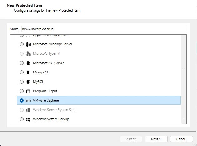 This Protected Item backs up VMware vSphere virtual machines by connecting directly to either a vCenter server or an ESXi host. Guest virtual machines do not have to be offline for the backup to happen.