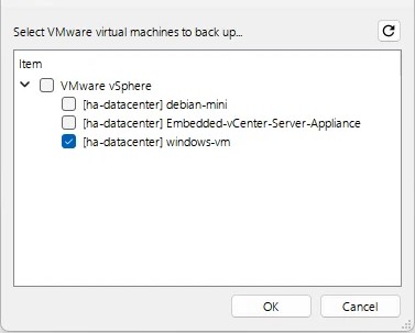 Click on the plus sign on the right to start selecting virtual machines. All virtual machines can be backed up by selecting the top level `VMware vSphere`. Individual virtual machine selection is also possible as well.