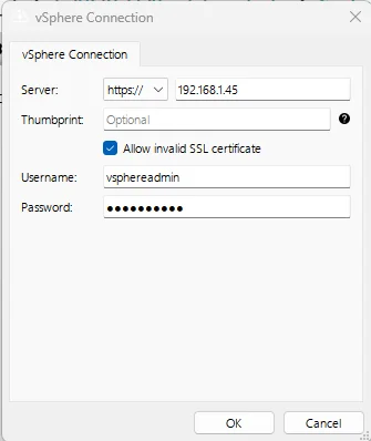 | Server                        | The vCenter/ESXi host. Also accepts `host:port` in case the host is running on a [custom port](https://kb.vmware.com/s/article/1021199). |