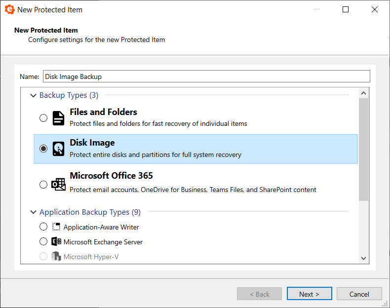Note: You need to have purchased a backup plan that includes the Disk Image feature in order to create a Disk Image Protected Item.
