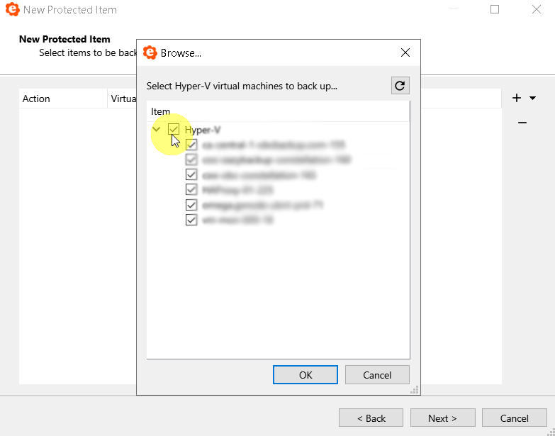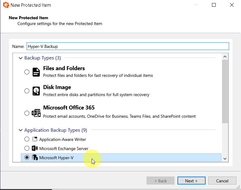 Step 2. Select Microsoft Hyper-V backup type and give the Protected Item a name: