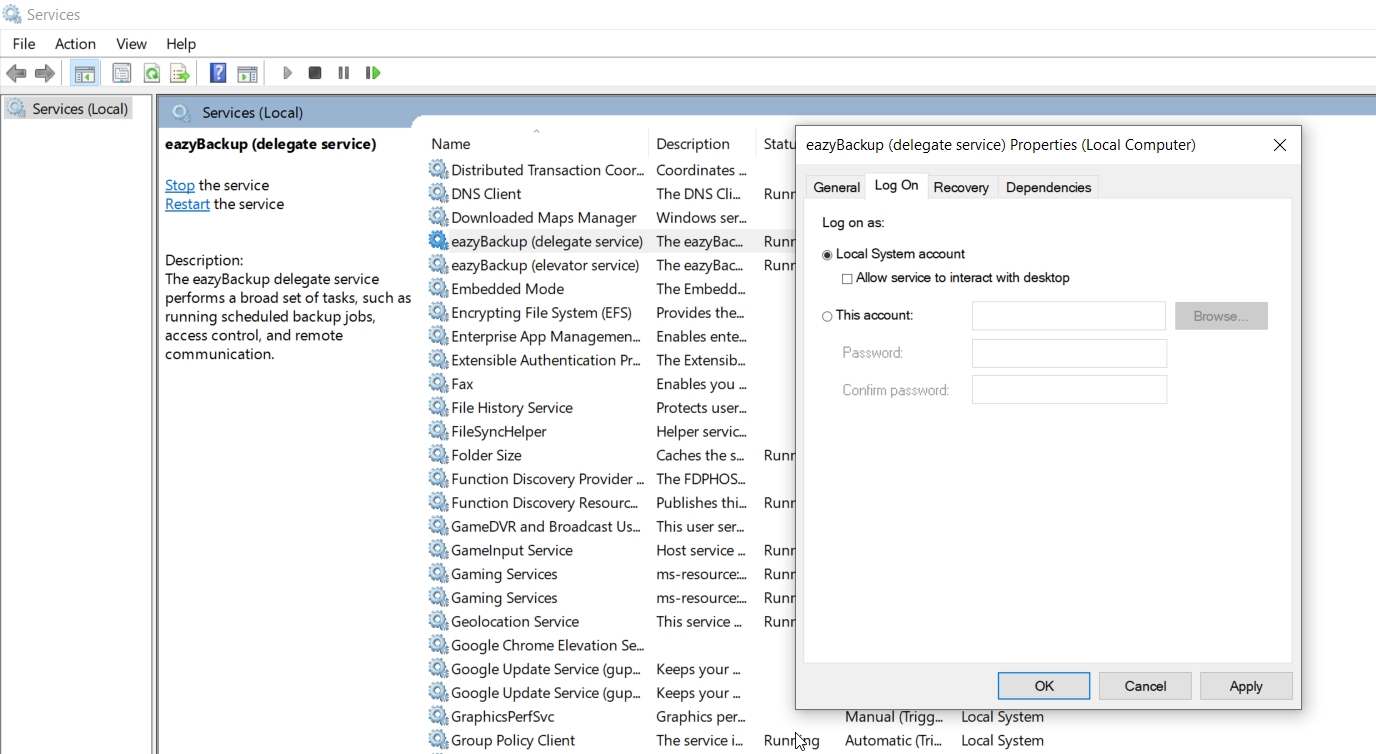 You will need to switch the eazybackup.delegate service user on this device to use the local system account, or another Windows user of your choice, such as your own account.