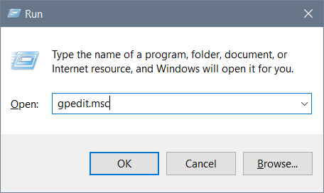 Press Windows+R to open the “Run” box. Type “gpedit.msc” and press enter.