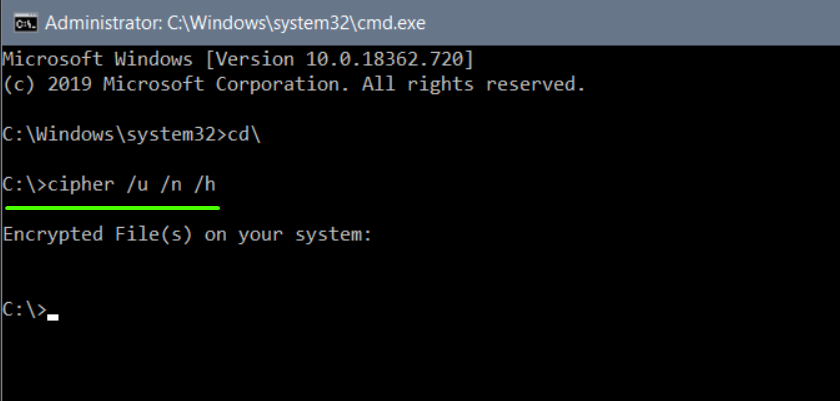 Once you are at C:\ you can run the cipher utility with the following command.